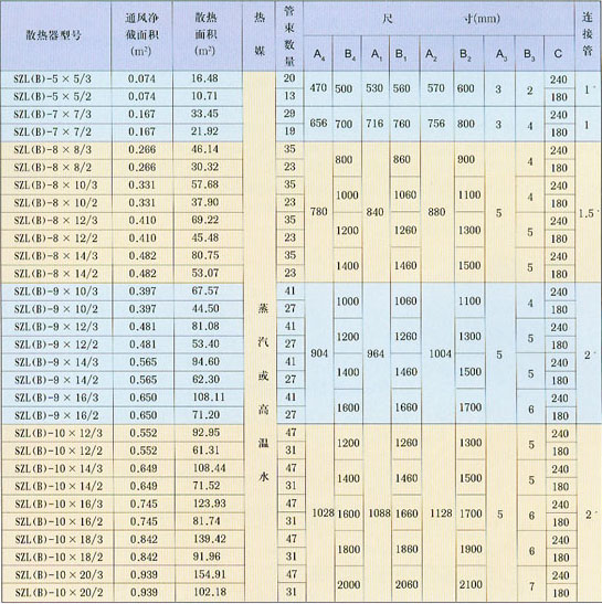 SZL(B)型翅片管散热器,用无缝钢管φ25×2.5mm作为基管,铝孔翅片管外径为直径57mm,根径为φ26.5mm,片距为2.8mm组成。散热性能好、使用可靠、耐腐蚀性、光洁、美观。应用于乳品、啤洒、食品、淀粉、化工、造纸、机械、医-药、空调、印染等行业。